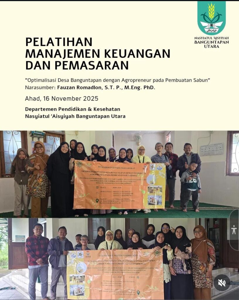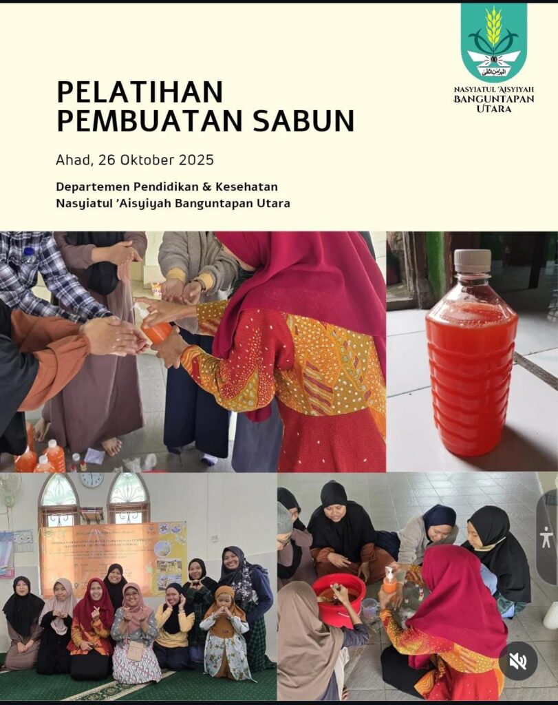Pelatihan Industri Rumahan: Pembuatan Sabun Cair dan Pengembangan Ide Bisnis untuk Organisasi Nasyiatul ‘Aisyiyah β Universitas Telkom Purwokerto sukses menyelenggarakan pelatihan kewirausahaan bagi anggota Nasyiatul ‘Aisyiyah Banguntapan Utara, dengan tema Pembuatan Sabun Cair Kegiatan ini digelar di Musholla Al-Furqon, Jalan Maguwo 120, pada Minggu (26/10/2025), Minggu (16/11/2025), dan Minggu (14/12/2025) selama 3 kali dalam 1 semester sebagai bagian dari program Pengabdian kepada Masyarakat (PkM) skema Hibah Internal yang mendapatkan pendanaan dari Universitas Telkom Purwokerto.
